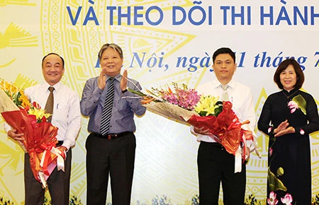Bộ trưởng Bộ Tư pháp Hà Hùng Cường trao quyết định bổ nhiệm và tặng hoa cho lãnh đạo Cục Quản lý xử lý vi phạm hành chính và Theo dõi thi hành pháp luật. Ảnh: TTXVN
