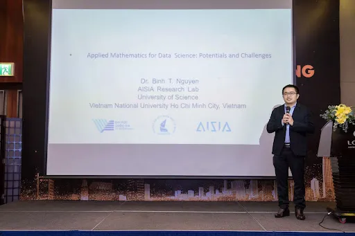 TS Nguyễn Thanh Bình, Khoa Toán- Tin trường ĐH Khoa học Tự nhiên trình bày chủ đề "Toán ứng dụng trong khoa học dữ liệu" tại buổi lễ ra mắt quỹ. Sự kiện thu hút gần 50 giáo sư, tiến sĩ, trưởng khoa Toán tại các trường ĐH lớn tại TP.HCM.