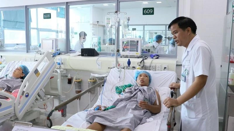 PGS.TS Bùi Xuân Cơ, Trưởng Khoa Hồi sức tích cực - BV Bạch Mai thăm khám cho bệnh nhân trong sự cố chạy thận ở Nghệ An. Ảnh: BVCC