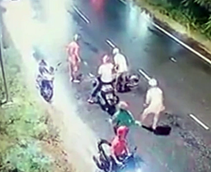 Clip ghi nhận, khi nạn nhân Bình chạy xe máy với tốc độ cao thì bị hai thanh niên truy đuổi từ phía sau dùng hung khí đâm vào lưng.