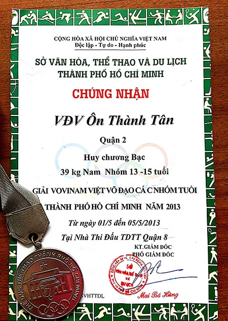 Giấy chứng nhận và huy chương bạc giải Vovinam của Ôn Thành Tân.