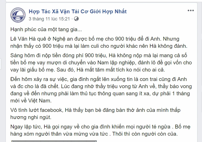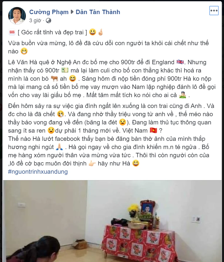 Tuy nhiên, từ ngày 3-10, nhiều tài khoản Facebook cá nhân, fanpage đăng tải, chia sẻ hình ảnh ông Tuân và câu chuyện sai sự thật: Anh Hà được bố mẹ cho 900 triệu nhưng anh không đi Anh mà mang vào miền Nam lập nghiệp, đánh lô đề; gia đình ở quê nhà ngất lên xuống...