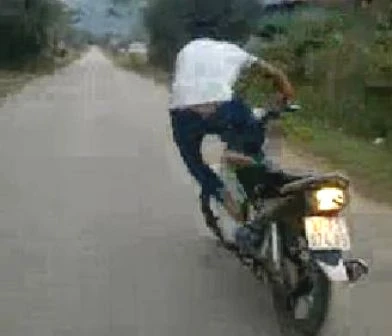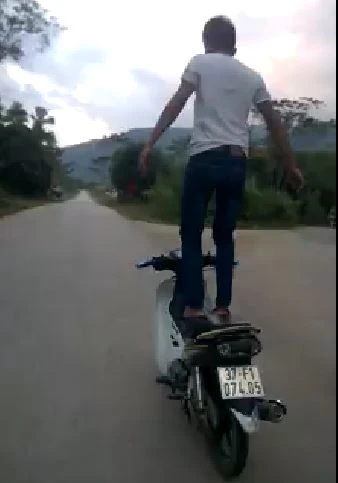 Nam thanh niên này không đội mũ bảo hiểm, điều khiển xe máy, thay vì ngồi trên yên xe thì nam thanh niên này buông tay lái, đứng thẳng trên yên và đưa hai cánh tay lên làm thăng bằng khi xe lao đi nhanh. Đến cuối video người thanh niên này bị ngã xe máy.