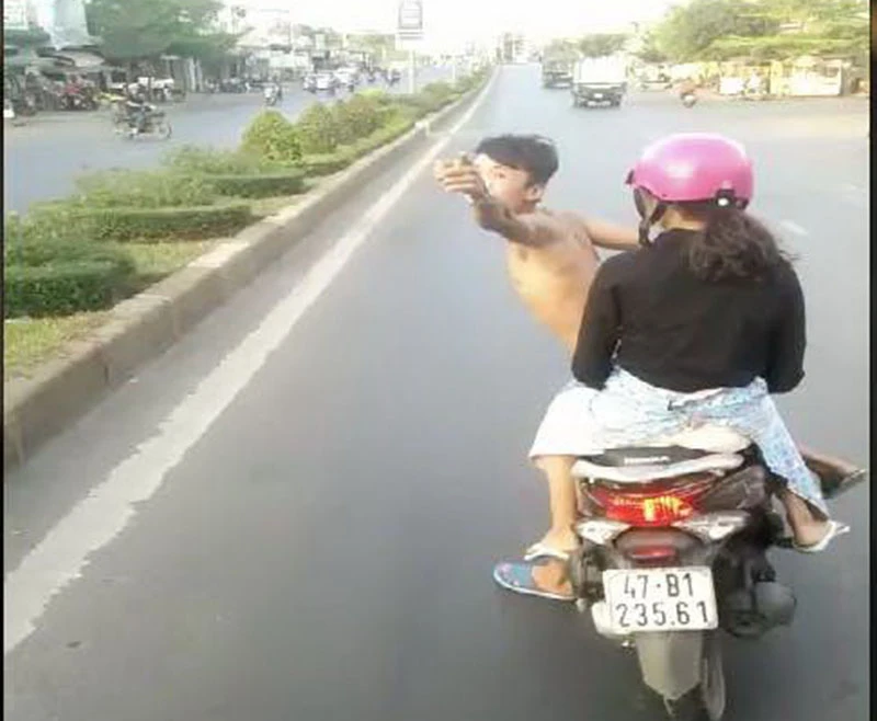 Trước đó, chiều 14-3, tài xế xe khách tên N. có quay lại clip một thanh niên cởi trần, không đội mũ bảo hiểm, đi xe Vision màu nâu chở theo một cô gái chạy lạng lách, đánh võng trước đầu xe. Khi tài xế bấm còi, thanh niên này còn dừng trước đầu ô tô chửi bới, dọa tài xế. Đến khi cô gái đi cùng khuyên can thì cả hai mới bỏ đi.