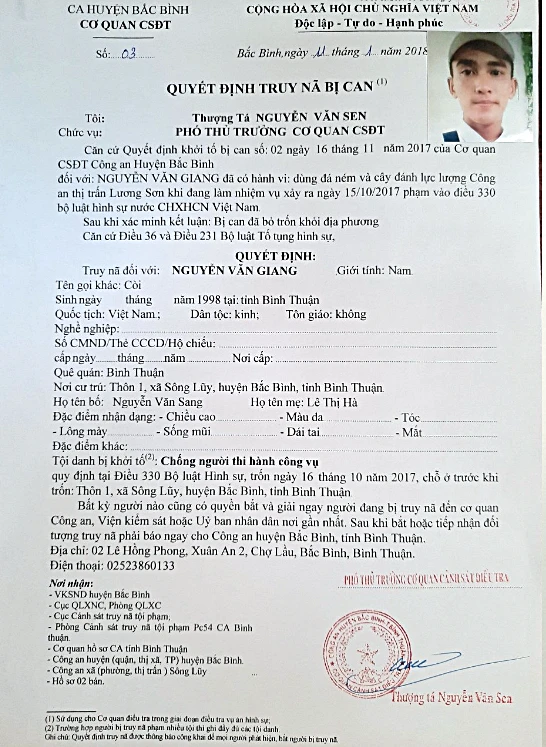 Công an huyện Bắc Bình đã bắt giữ nhóm thanh niên trên, riêng Giang bỏ trốn. Tháng 1-2018, Cơ quan CSĐT Công an huyện Bắc Bình ra quyết định truy nã Giang trên toàn quốc. Sau đó đến tháng 4-2018, TAND huyện Bắc Bình kết án 5 bị cáo, đồng bọn của Giang về tội chống người thi hành công vụ với tổng cộng 63 tháng tù giam.