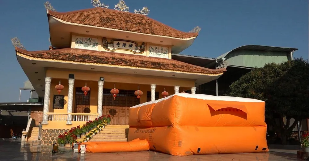 Lực lượng Cảnh sát PCCC và cứu hộ cứu nạn đã triển khai bơm phao hơi cứu hộ đề phòng người này nhảy xuống nhưng thanh niên này vẫn ôm nóc chùa cố thủ.