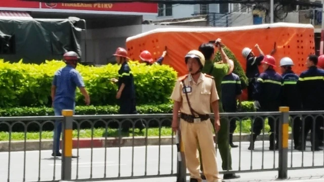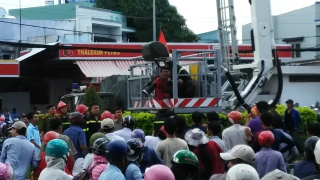 Sau khoảng 15 phút, lực lượng Cảnh sát PCCC Công an quận Bình Tân đã điều động hai xe chữa cháy. Cảnh sát PCCC Công an TP cũng huy động một xe thang cùng nhiều cán bộ, chiến sĩ phối hợp với các đơn vị sở tại để triển khai các biện pháp nhằm giải cứu thanh niên này.