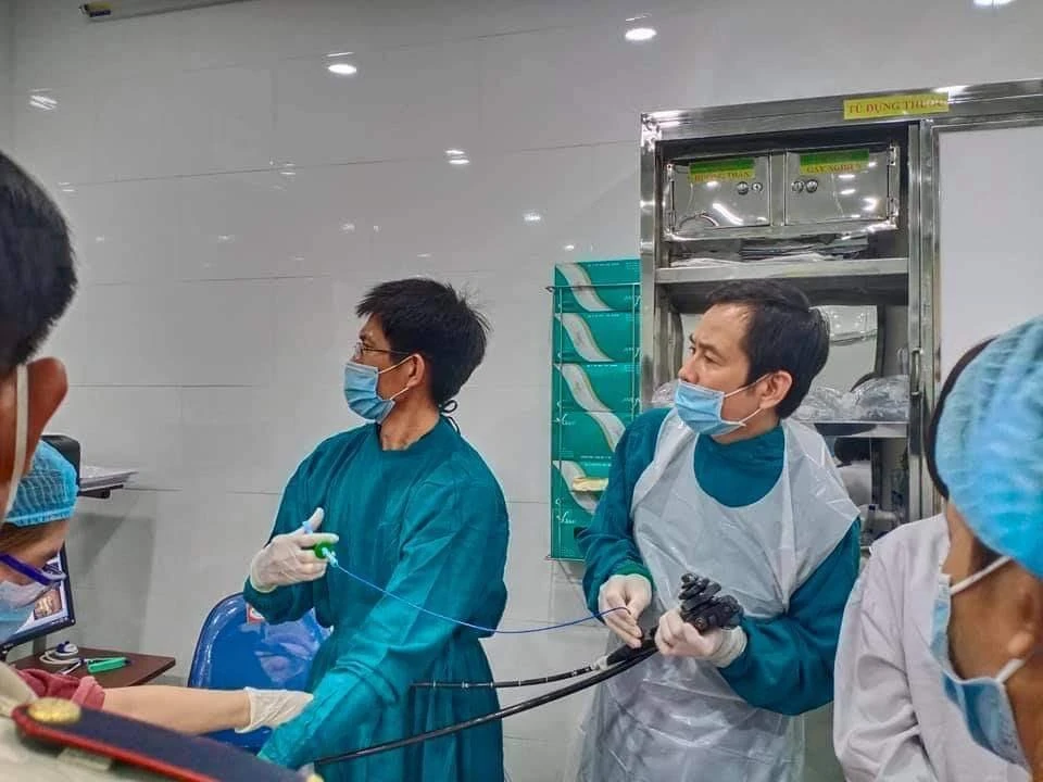 Các bác sĩ đang thực hiện gắp chiếc bấm móng tay cho bệnh nhân. Ảnh: BVCC