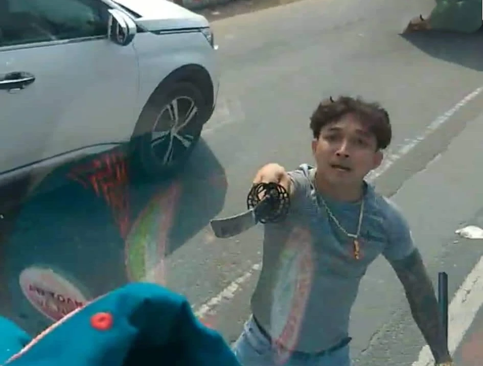 Linh cùng một phụ nữ xuống xe và mở cốp xe phía sau lấy ra mỗi người một cây kiếm. Họ đi sang hai cửa của chiếc xe tải giơ kiếm lên chửi bới.