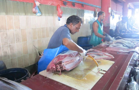 Bác Hassan mổ cá ngừ (người tiếp chuyện với tác giả bài viết).