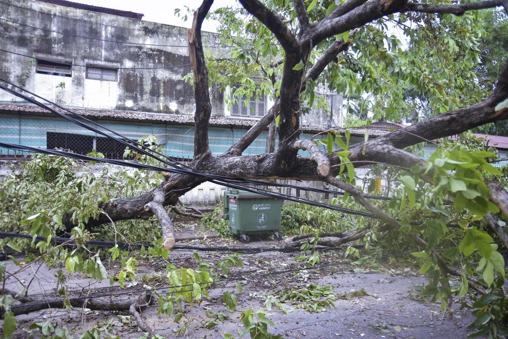 Tại đường Nguyễn Huệ, nhiều cây xanh nằm ngổn ngang hai bên đường. Cáp viễn thông chắn ngang các tuyến đường. Ảnh: NGUYỄN DO
