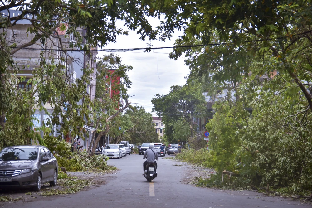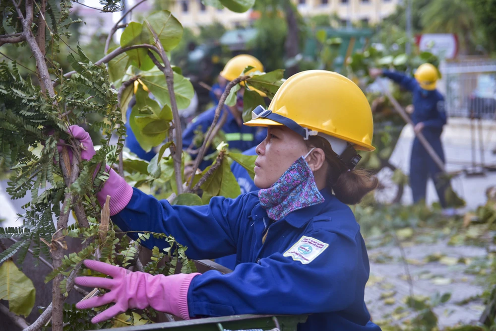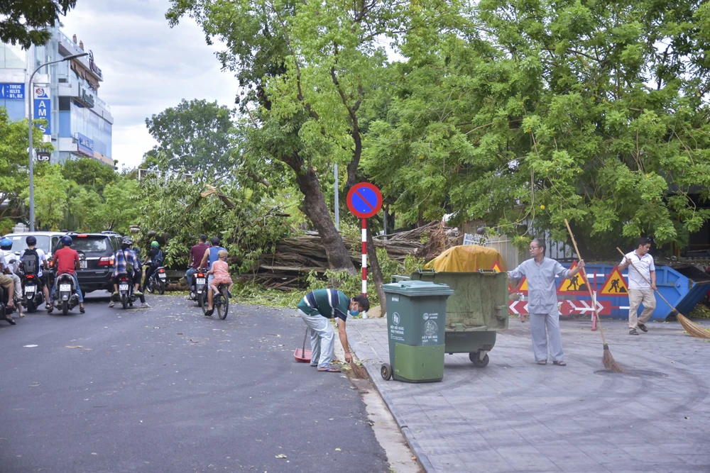Công nhân khẩn trương dọn dẹp đường phố sau bão. Ảnh chụp tại đường Hùng Vương. Ảnh: NGUYỄN DO