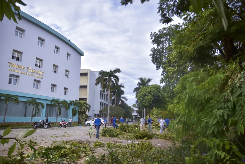 Dọn dẹp những cây đổ gãy trong khuôn viên Bệnh viện Trung ương Huế. Ảnh: NGUYỄN DO