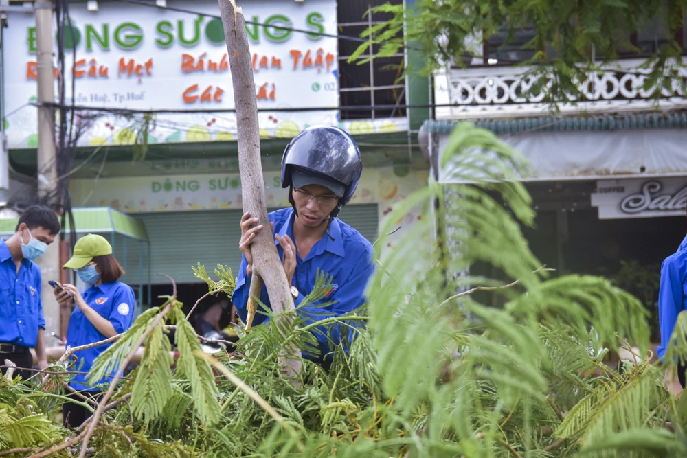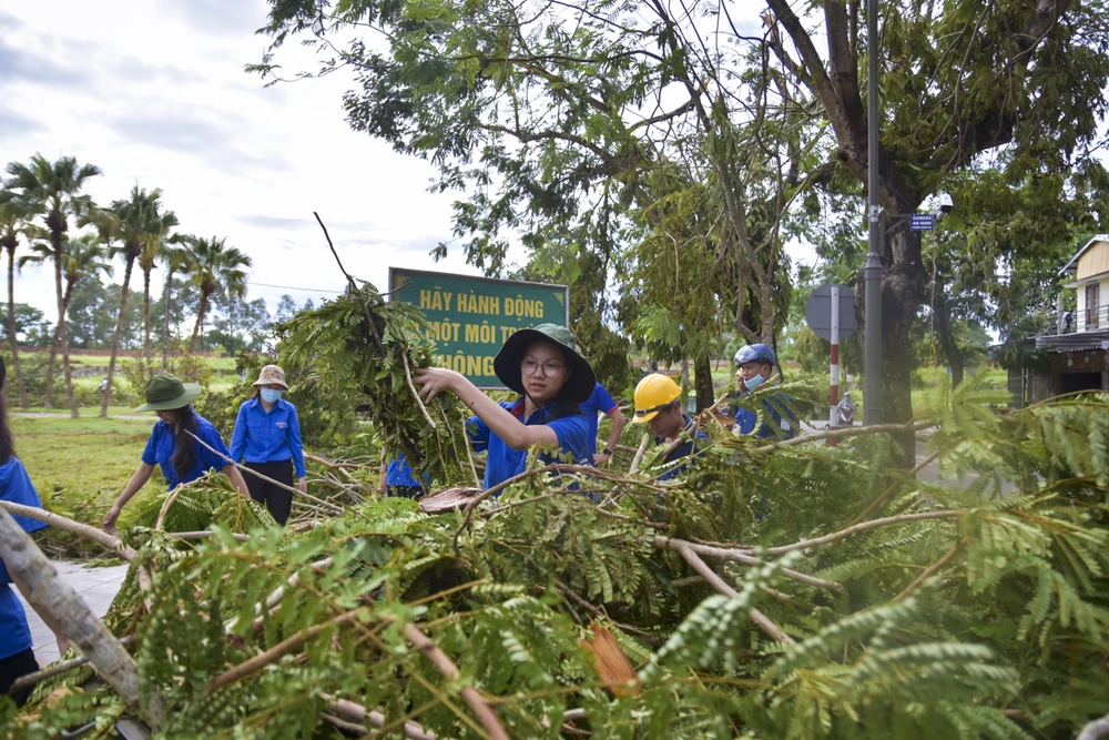 Đoàn thanh niên tham gia dọn dẹp đường phố sau bão. Ảnh: NGUYỄN DO