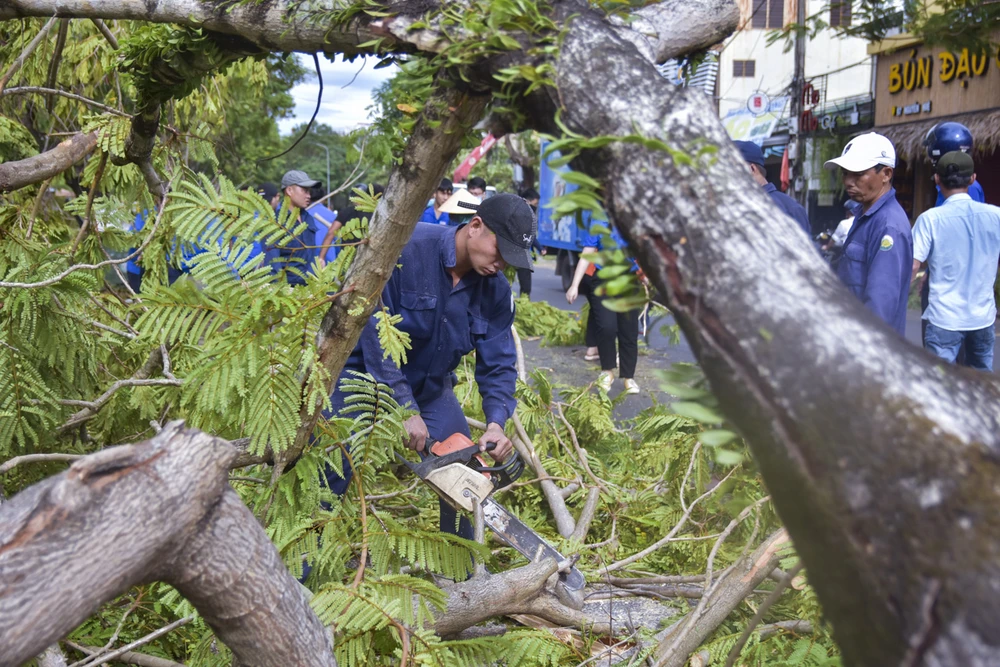 Dùng cưa máy cắt những thân cây to bị đổ, gãy. Ảnh: NGUYỄN DO