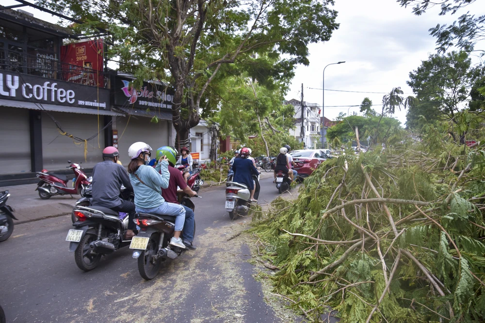 9 giờ sáng ngày 19-9, đúng 24 tiếng sau khi cơn bão số 5 quét qua, tại TP Huế giao thông cơ bản được thông suốt, nhưng công việc khắc phục thiệt hại do mưa bão gây ra vẫn đang được cơ quan chức năng, người dân khẩn trương tiến hành. Ảnh: NGUYỄN DO
