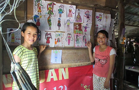 Trên bức vách của căn nhà dán đầy những bức tranh vẽ nhiều màu. Tác giả của những bức tranh là Ngô Huỳnh Như, con anh Vinh, đang học lớp 6 Trường THCS Hưng Thạnh. Như cho biết: “Con thích vẽ lắm. Mấy cô chú cho bút màu, con tự tập vẽ. Con coi phim hoạt hình, thích nhân vật nào vẽ theo nhân vật đó”.