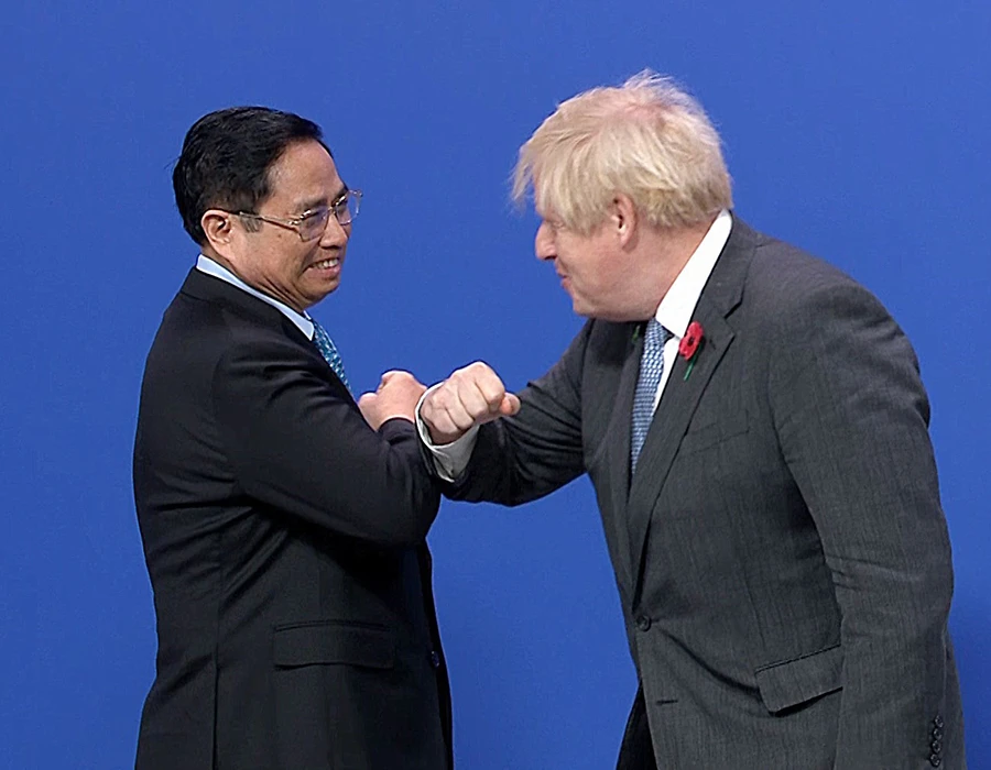 Thủ tướng Anh Boris Johnson đón Thủ tướng Phạm Minh Chính đến dự hội nghị lần thứ 26 các bên tham gia Công ước khung của Liên Hợp Quốc về biến đổi khí hậu (COP26). Ảnh: TTXVN