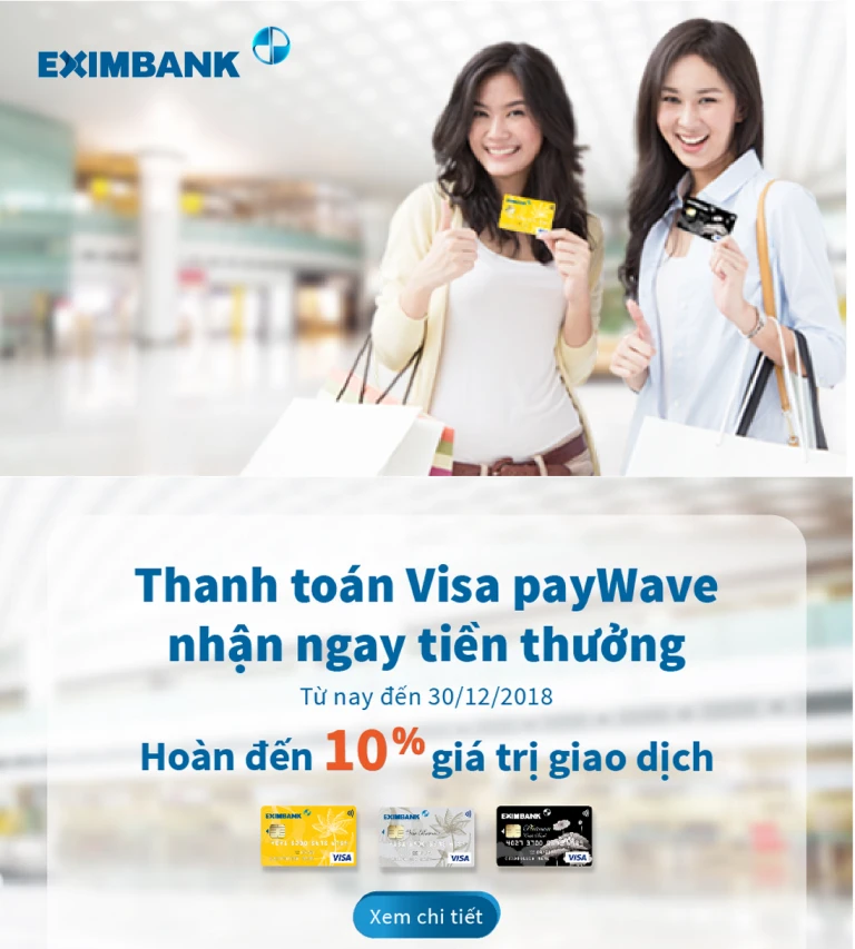 Với thẻ ghi nợ Eximbank khi phát sinh giao dịch thanh toán từ 200.000 đồng, khách hàng sẽ được hoàn tiền 5% giá trị giao dịch, tối đa 50.000 đồng; với thẻ tín dụng Eximbank khi phát sinh giao dịch thanh toán từ 200.000 đồng, khách hàng sẽ được hoàn tiền 10% giá trị giao dịch, tối đa 100.000 đồng