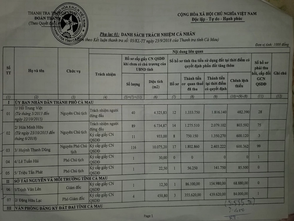 Cụ thể, nội dung Bản kết luận thể hiện từ 2014 đến 2016, UBND TP. Cà Mau đã giao đất cho 134 hộ dân trái quy định của pháp luật. Từ đó, thanh tra đề nghị thu hồi đất, trả tiền cho dân. Kèm theo bản kết luận là phụ lục trách nhiệm cá nhân, thể hiện 16 cán bộ liên quan phải chịu trách nhiệm cá nhân với tổng số tiền hơn 5,5 tỉ đồng.