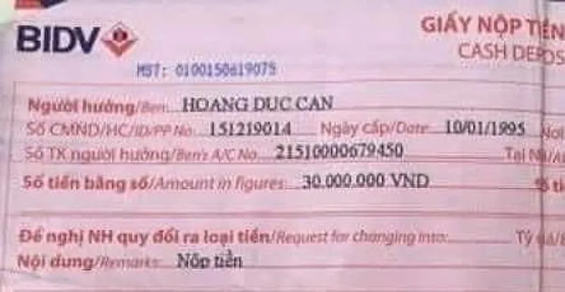 Giấy nộp tiền cháu bà Tích nộp cho ông Cần.