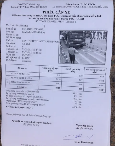 Kết quả cân xe cho thấy, xe chở quá tải trên hơn 101% trọng lượng hàng hóa cho phép chuyên chở. Phía Thanh tra giao thông Vĩnh Long cho biết tổng xác xe trên 20,7 tấn và hàng hóa được chở chỉ 32 tấn và tổng cộng xe này là 53 tấn nhưng ghi nhận khi cân cho thấy tổng trọng lượng xe lên đến trên 85,3 tấn. Lực lượng thanh tra giao thông cho biết theo kiểm định thì rơ-mooc chỉ có chiều dài 14,5m, (thực tế đo lại dài đến trên 18,1m). Thanh tra giao thông cũng phát hiện đoạn giữa rơ-mooc có thể dịch chuyển để thu ngắn hoặc kéo dài ra thêm. Qua kiểm tra, sổ đăng kiểm của rơ-mooc bị CSGT tạm giữ do vi phạm trước đó (ngày 16-5) nhưng chủ xe vẫn đưa phương tiện vào lưu thông.