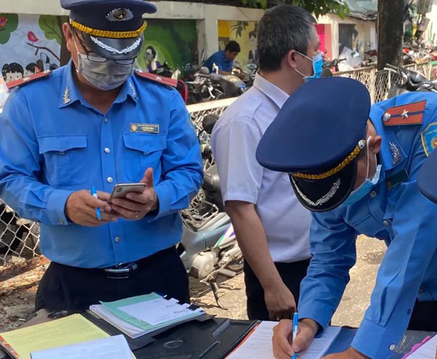 Thanh tra giao thông đội số 8 lập biên bản 1 trường hợp vi phạm vận tải trong sân bay Tân Sơn Nhất. Ảnh: Hải Phan