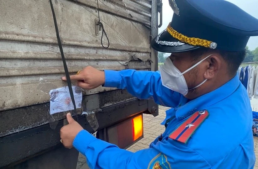 Sau khi cân kiểm tra, xe chở quá tải thuộc diện bị tạm giữ được Thanh tra giao thông đội số 1 niêm phong thùng hàng, đưa về bãi. Ảnh: CẨM VÂN