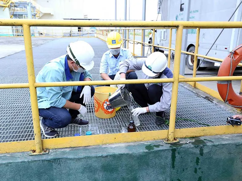 Tổ công tác liên ngành lấy mẫu và kiểm tra nước thải ra môi trường của Formosa.Ảnh: TTXVN