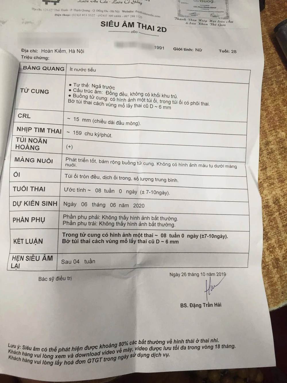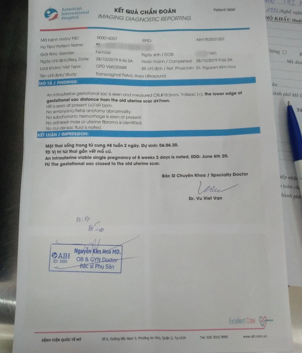 Kết quả chẩn đoán thai tám tuần của BV quốc tế Mỹ AIH. (Ảnh do người nhà cung cấp)