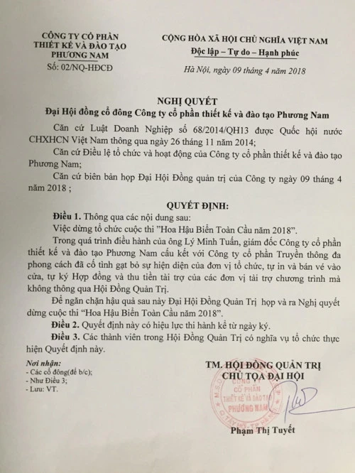 Theo bà Tuyết và thông tin từ cuộc họp cổ đông Công ty Phương Nam ngày 9-4, có người đã mạo danh Công ty Phương Nam tổ chức cuộc thi “Hoa hậu Biển Việt Nam toàn cầu 2018” với nhiều điều không minh bạch, vi phạm pháp luật nên Công ty Phương Nam yêu cầu dừng cuộc thi, hủy giấy phép để ngăn chặn những hậu quả về sau.