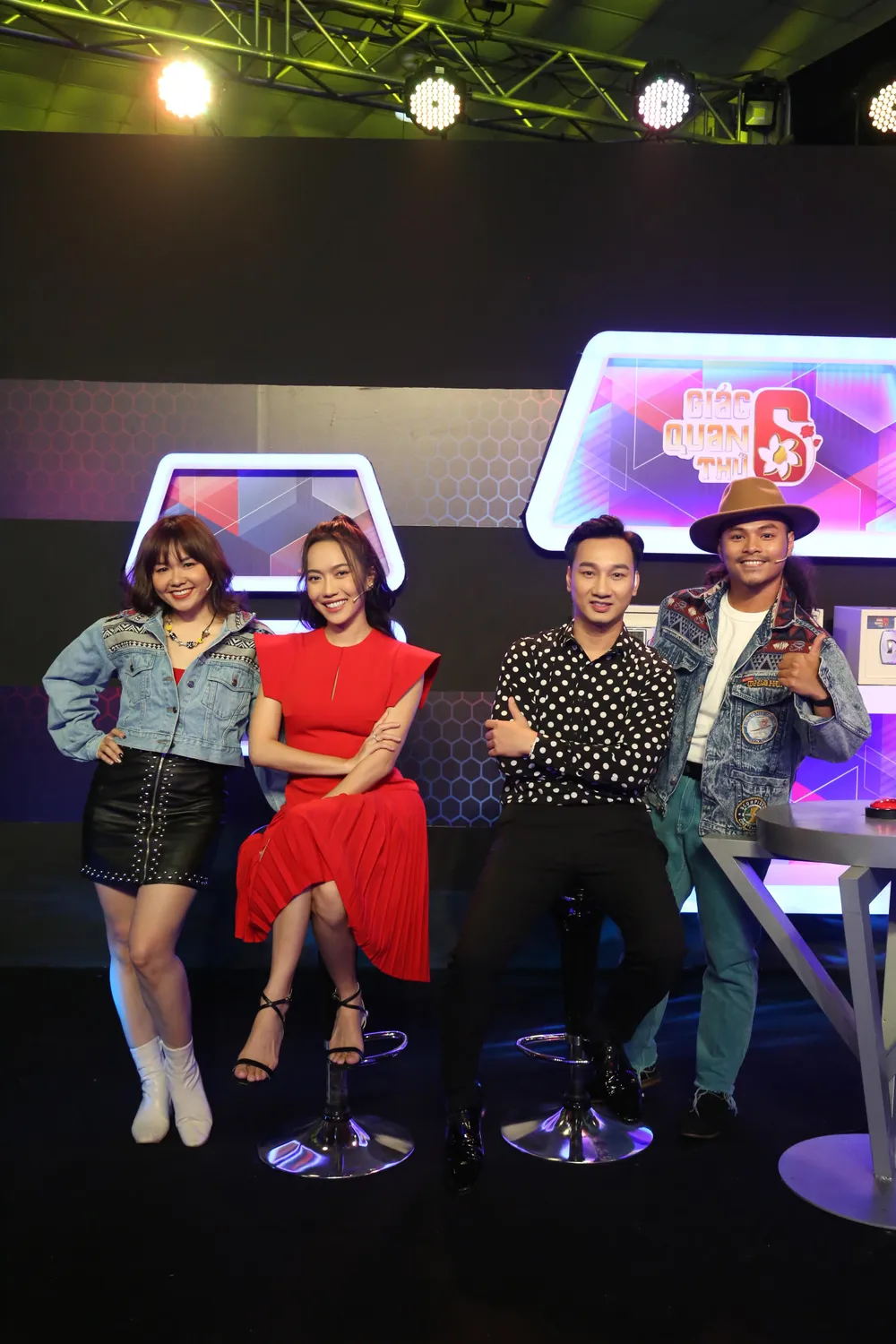 Diệu Nhi ngồi bên cạnh đàn anh nhưng không chịu an phận, hay pha trò với cả Thành Trung lẫn khách mời.