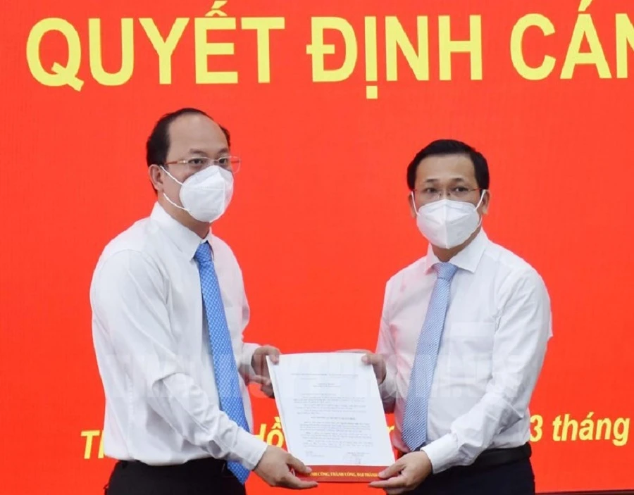 Phó Bí thư Thành ủy TP.HCM Nguyễn Hồ Hải trao quyết định cho ông Nguyễn Hoàng Anh (bên phải). Ảnh: Web Thành ủy TP.HCM