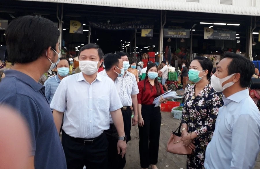 Phó Chủ tịch UBND TP Dương Anh Đức đi kiểm tra công tác phòng chống dịch ở chợ đầu mối Bình Điền sáng 3-5. Ảnh: TÁ LÂM