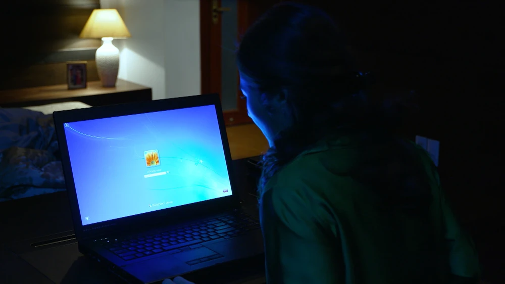 Thanh Vân lén lút kiểm tra laptop của Đăng Duy. Ảnh: SEN VÀNG