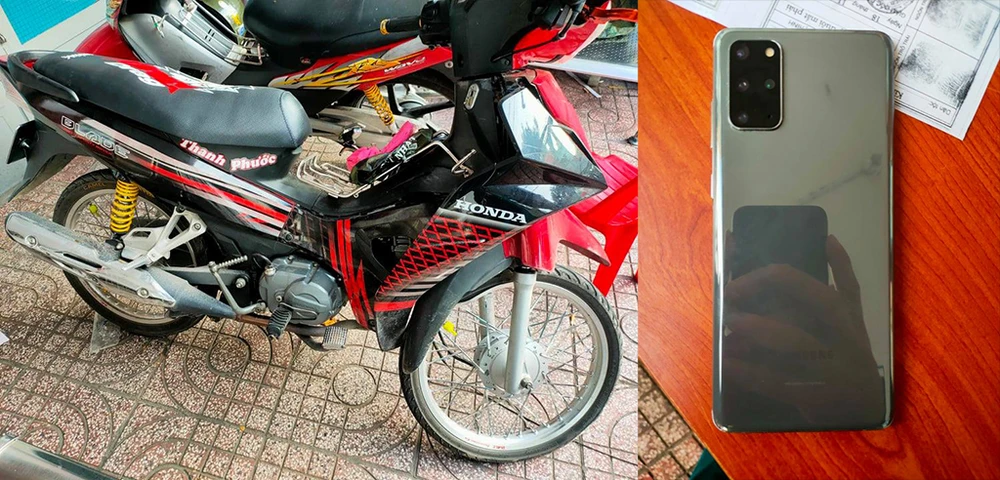 Xe máy dùng để gây án và chiếc điện thoại tang vật. Ảnh: HT