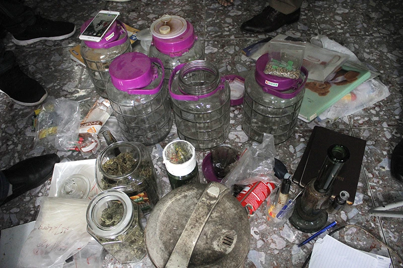 Lực lượng công an cũng phát hiện hàng loạt dụng cụ phục vụ trồng, chiết xuất tinh dầu cần sa như đèn tuýp, đèn sưởi, các hộp nhựa, bình thủy tinh, nồi cơm điện.