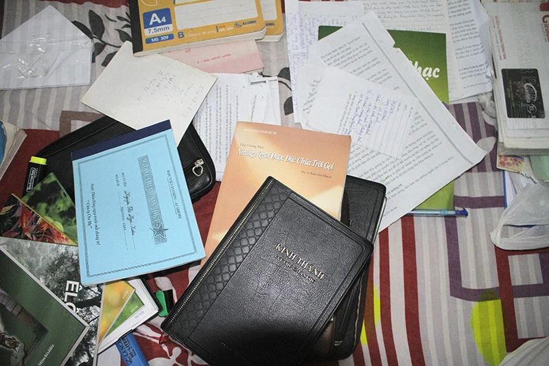 Các tài liệu liên quan tới việc truyền đạo trái phép, công an thu giữ tại nhà nghi can Hiếu. Ảnh: ĐH