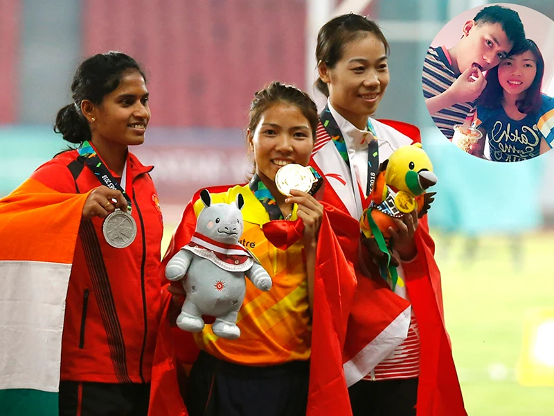 Thu Thảo (giữa) nhỏ con nhất nhưng nhảy xa nhất châu Á và hình ảnh hiếm hoi khi thư giãn cùng chồng. Ảnh: N.TRUNG