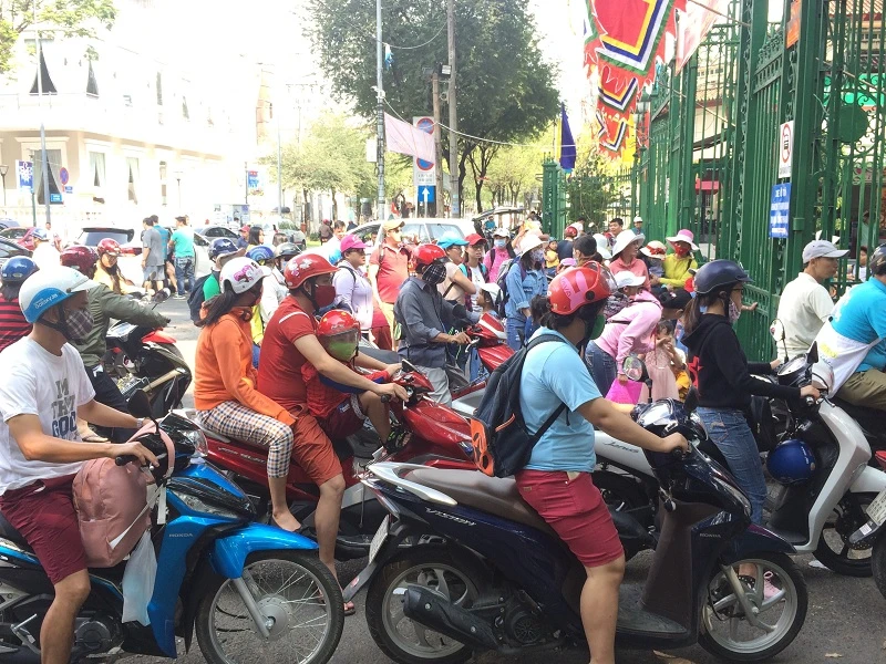 Khoảng 7 giờ giờ sáng, cổng Thảo Cầm Viên trên đường Nguyễn Bỉnh Khiêm (quận 1) bắt đầu đông nghẹt. Càng về trưa, lượng người đổ về đây tham quan ngày càng đông. Các bãi giữ xe của Thảo Cầm Viên đều hết chỗ khiến nhân viên phải tận dụng các bãi đất trống.