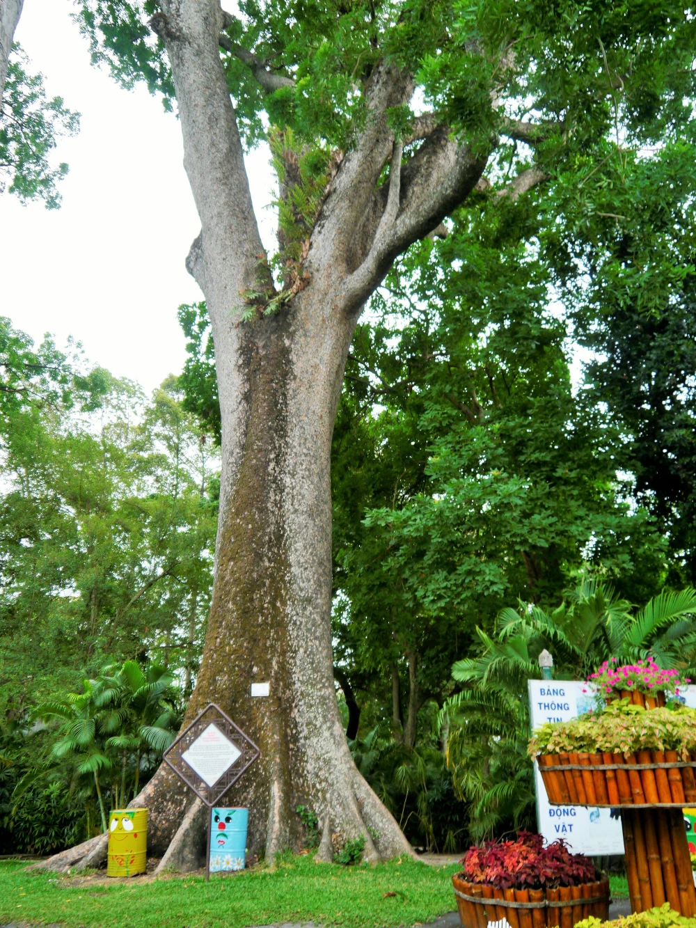 Bên cạnh những công trình cổ, Thảo Cầm Viên còn sở hữu bộ hàng trăm cây cổ thụ khổng lồ. Trong ảnh là gốc cây sọ khỉ, được xem là cây lớn nhất trong thành phố với chiều cao hiện tại trên 40 m và chu vi thân vào khoảng hơn 3 m.