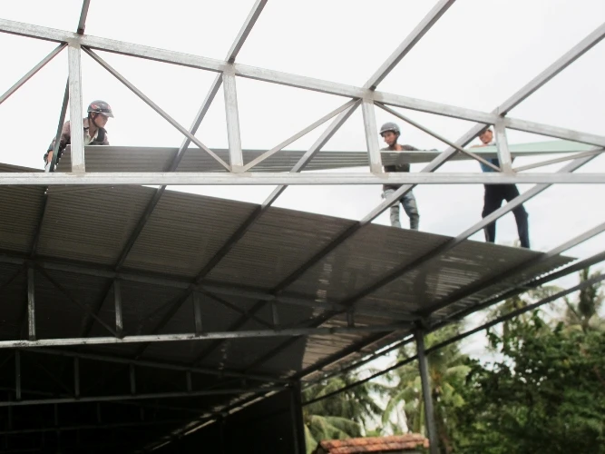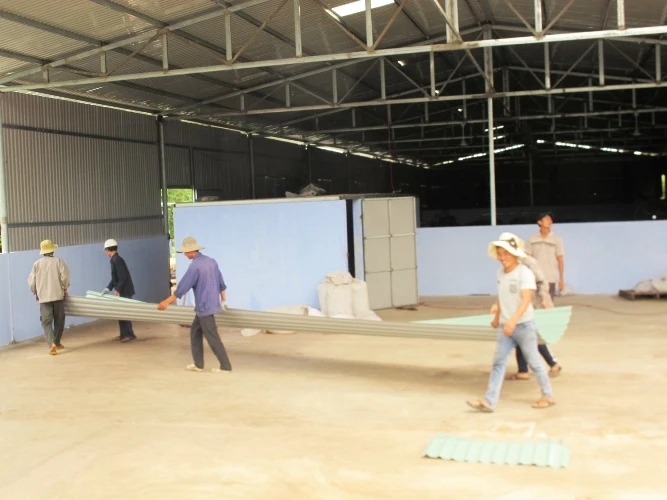 Công ty TNHH Long Việt bắt đầu tháo dỡ nhà xưởng trái phép trên khu đất của bí thư Huyện ủy Tuy An. Ảnh: TẤN LỘC