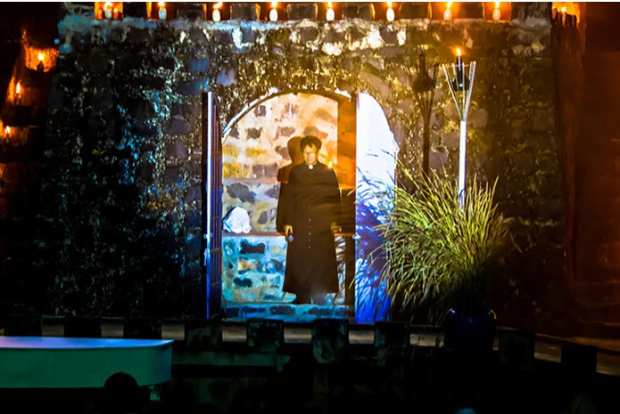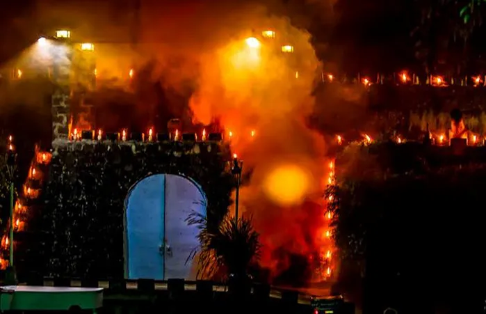 Ánh sáng sân khấu huyền ảo được thắp sáng bằng đuốc.