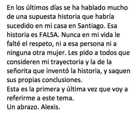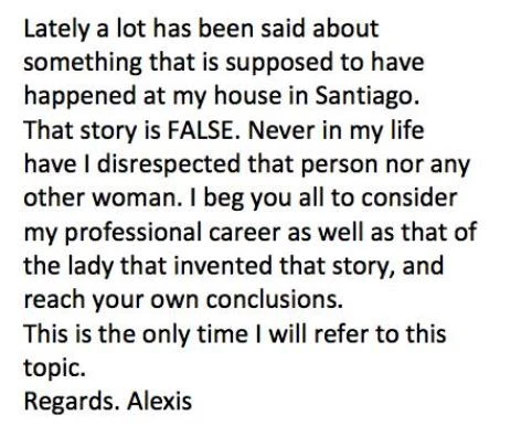 “Đã có quá nhiều những bàn tán về những gì được cho là đã xảy ra tại nhà của tôi ở Santiago. Câu chuyện đó hoàn toàn không đúng sự thật. Trong đời mình, tôi chưa bao giờ coi thường người đó cũng như bất cứ phụ nữ nào khác. Tôi mong tất cả các bạn hãy xem xét sự chuyên nghiệp của tôi trên sân cỏ cũng như câu chuyện mà người phụ nữ đó sáng tạo ra và đưa ra kết luận của riêng mình. Đây cũng là lần duy nhất tôi đề cập tới vấn đề này”.