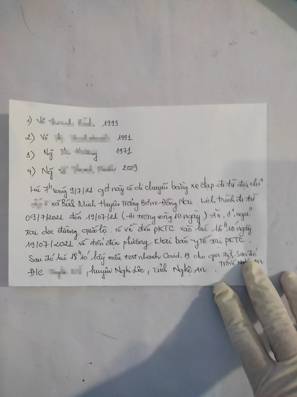 "Các đồng chí trong Chốt hỏi thăm được biết 4 mẹ con là người Nghi Lộc, Nghệ An vì hoàn cảnh khó khăn phải bươn chải nơi đất khách quê người ở Trảng Bom, Đồng Nai. Nhưng đại dịch COVID-19 ập đến càng làm hoàn cảnh của gia đình thêm khó khăn, 4 mẹ con đã thất nghiệp từ 4 tháng nay, không có tiền trang trải cuộc sống phải đạp xe đạp từ Đồng Nai về quê. Bắt đầu từ ngày 9-7-2021 đến 19-7-2021 thì về đến Ninh Phước (300 km).