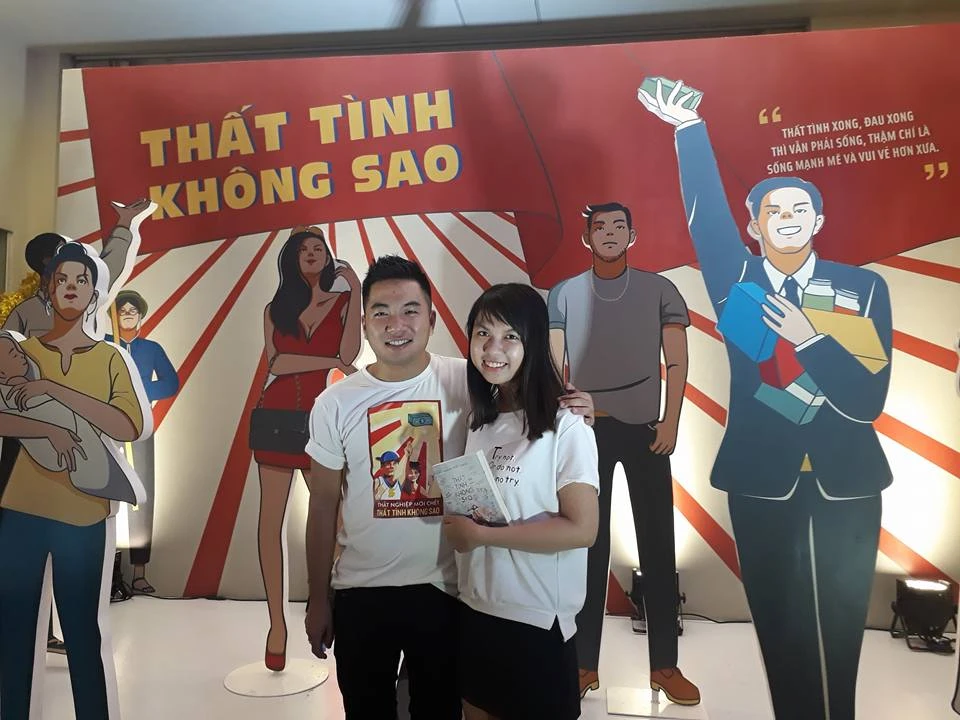 Tác giả với chiếc áo có dòng chữ "Thất tình không sao, thất nghiệp mới chết" và bạn đọc của mình.