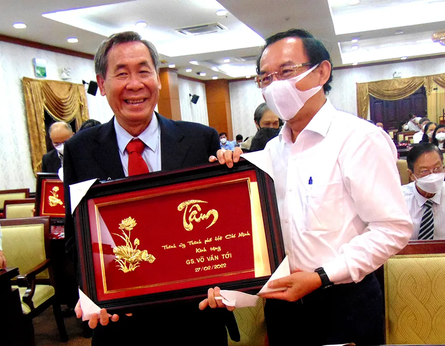 Bí thư Thành ủy TP.HCM Nguyễn Văn Nên tặng quà cho GS Võ Văn Tới. Ảnh: TRẦN NGỌC