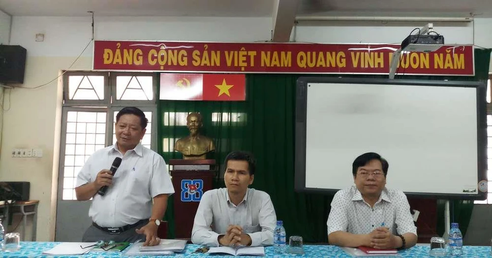 Ông Lương Văn Định, Hiệu trưởng nhà trường đang trao đổi thông tin với báo chí về quyết định kỷ luật với thầy Phạm Quốc Đạt. Ảnh: NGUYỄN QUYÊN