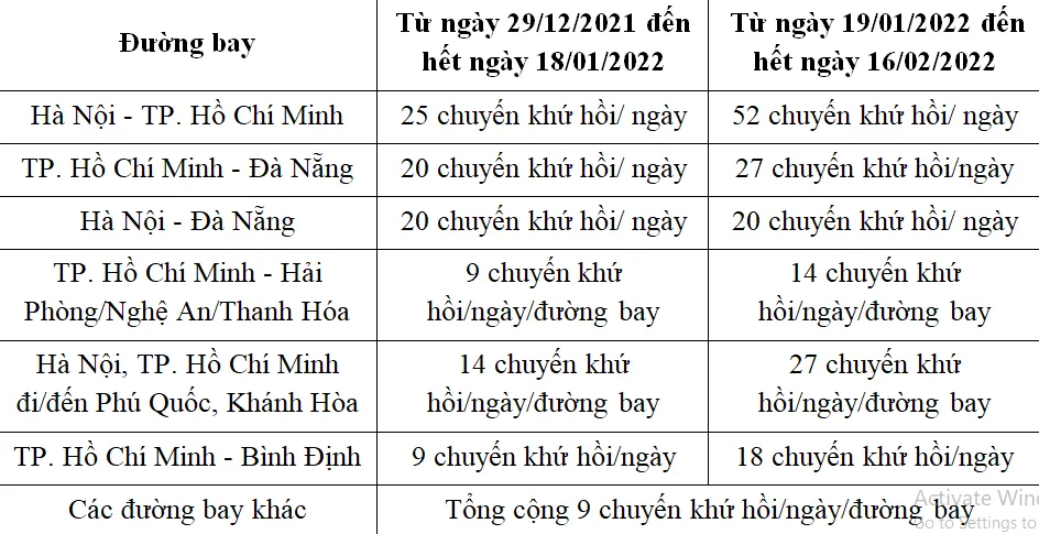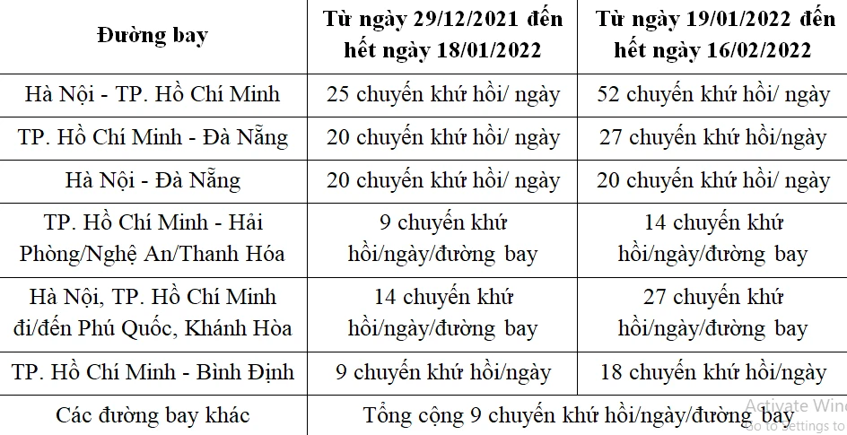Theo đó, từ ngày 29-12-2021 đến hết ngày 16-2-2022 các đường bay nội địa được thực hiện theo tần suất tăng dần, trung bình từ 9 đến 52 chuyến/ngày.