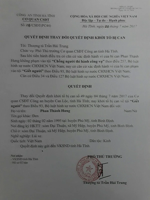 Theo đó, Cơ quan CSĐT Công an Hà Tĩnh thay đổi quyết định khởi tố bị can của Cơ quan CSĐT Công an huyện Can Lộc (Hà Tĩnh) đối với Hưng từ tội chống người thi hành công vụ sang tội giết người.